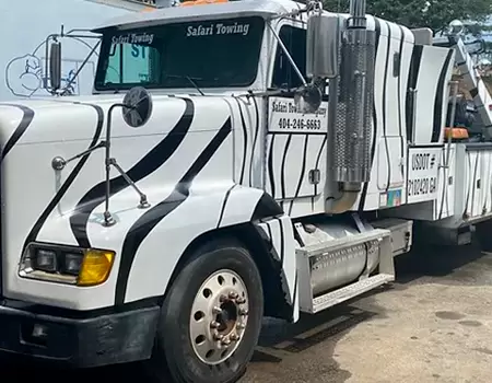 ​Safari Towing Company is family owned and operated and has been in business since 2009. We offer you the best 24/7 towing services for big rigs, tractor trailers and other large commercial vehicles in the Metro Atlanta area. Our well-known, fully equipped zebra print tow trucks are capable of towing the largest vehicles. Is your vehicle a beast? Call Safari Towing Company! We can tow it! If you need vehicle storage in Atlanta, we can do that too! We can store vehicles at our high security, gated and electrically fenced vehicle recovery lot in Atlanta