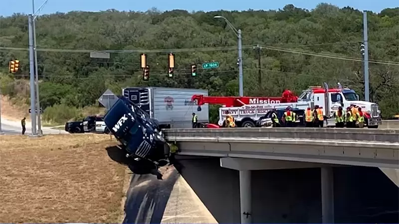 In a shocking incident that unfolded on a Texas bridge, a semi truck found itself dangerously dangling after a lane change gone awry. The fateful event took place on Wednesday morning, August 9th, in the vibrant city of San Antonio. Specifically, the scene of the incident was the Green Mountain Road bridge situated above the bustling Loop 1604. As per the report from reliable sources at KSAT News, the calamity began when a Honda vehicle carelessly sideswiped a Dodge Charger while attempting to change lanes. The impact propelled the Charger into an uncontrollable spin, hurling it perilously into the path of an opposing semi truck. Despite the truck driver's frantic attempts to brake and evade the impact, the unfortunate outcome resulted in a forceful t-bone impact between the truck and the Honda.