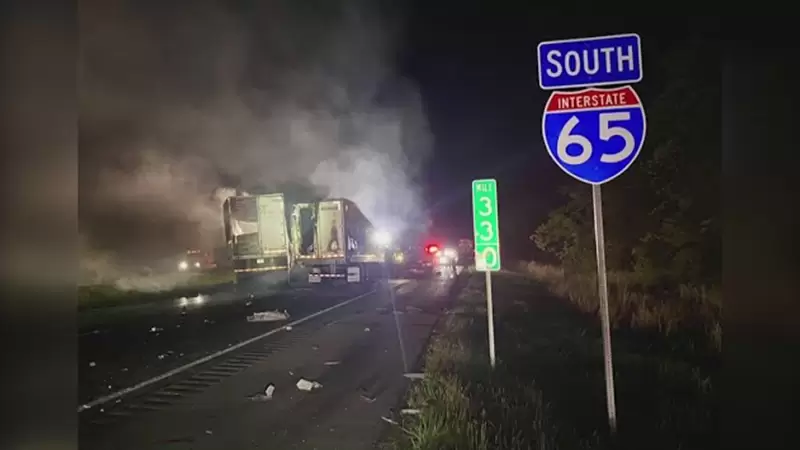 A multi-semi-truck collision resulting in fatalities occurred near Austin, prompting a swift response from the local law enforcement. The incident, which took place at 11:50 p.m. on Monday on I-65 South, involved a white Volvo truck coming to a stop in traffic, with a second truck following suit. Tragically, a third truck failed to slow down in time, causing a fiery crash between the vehicles. Both the second and third truck drivers lost their lives in the collision, while a passenger in the third truck sustained significant injuries and burns. The injured individual was promptly transported to a hospital in Louisville for treatment.